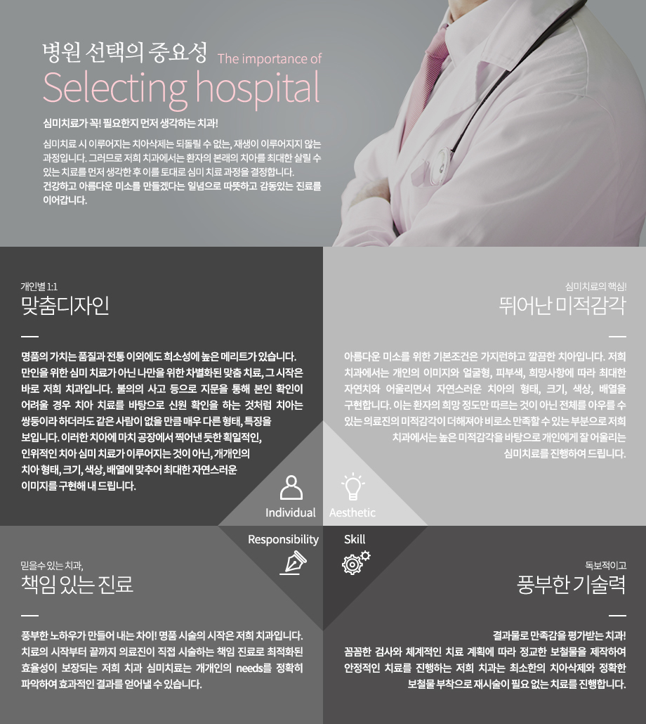 심미치료 병원선택의 중요성! 심미치료가 꼭! 필요한지 먼저 생각하는 치과! 심미치료 시 이루어지는 치아삭제는 되돌릴 수 없는, 재생이 이루어지지 않는 과정입니다. 그러므로 저희 치과에서는 환자의 본래의 치아를 최대한 살릴 수 있는 치료를 먼저 생각한 후 이를 토대로 심미 치료 과정을 결정합니다. -개인별 1:1 맞춤디자인 명품의 가치는 품질과 전통 이외에도 희소성에 높은 메리트가 있습니다. 만인을 위한 심미 치료가 아닌 나만을 위한 차별화된 맞춤 치료, 그 시작은 바로 저희 치과입니다. 불의의 사고 등으로 지문을 통해 본인 확인이 어려울 경우 치아 치료를 바탕으로 신원 확인을 하는 것처럼 치아는 쌍둥이라 하더라도 같은 사람이 없을 만큼 매우 다른 형태, 특징을 보입니다. 이러한 치아에 마치 공장에서 찍어낸 듯한 획일적인, 인위적인 치아 심미 치료가 이루어지는 것이 아닌, 개개인의 치아 형태, 크기, 색상, 배열에 맞추어 최대한 자연스러운 이미지를 구현해 내 드립니다. -책임 있는 진료 풍부한 노하우가 만들어 내는 차이! 명품 시술의 시작은 저희 치과입니다. 치료의 시작부터 끝까지 의료진이 직접 시술하는 책임 진료로 최적화된 효율성이 보장되는 저희치과 심미치료는 개개인의 needs를 정확히 파악하여 효과적인 결과를 얻어낼 수 있습니다. -풍부한 기술력 결과물로 만족감을 평가받는 저희 치과! 꼼꼼한 검사와 체계적인 치료 계획에 따라 정교한 보철물을 제작하여 안정적인 치료를 진행하는 저희 치과는 최소한의 치아삭제와 정확한 보철물 부착으로 재시술이 필요 없는 치료를 진행합니다. -뛰어난 미적감각 아름다운 미소를 위한 기본조건은 가지런하고 깔끔한 치아입니다. 저희치과에서는 개인의 이미지와 얼굴형, 피부색, 희망사항에 따라 최대한 자연치와 어울리면서 자연스러운 치아의 형태, 크기, 색상, 배열을 구현합니다. 이는 환자의 희망 정도만 따르는 것이 아닌 전체를 아우를 수 있는 의료진의 미적감각이 더해져야 비로소 만족할 수 있는 부분으로 저희치과에서는 높은 미적감각을 바탕으로 개인에게 잘 어울리는 심미치료를 진행하여 드립니다. 건강하고 아름다운 미소를 만들겠다는 일념으로 따뜻하고 감동있는 진료를 이어갑니다.