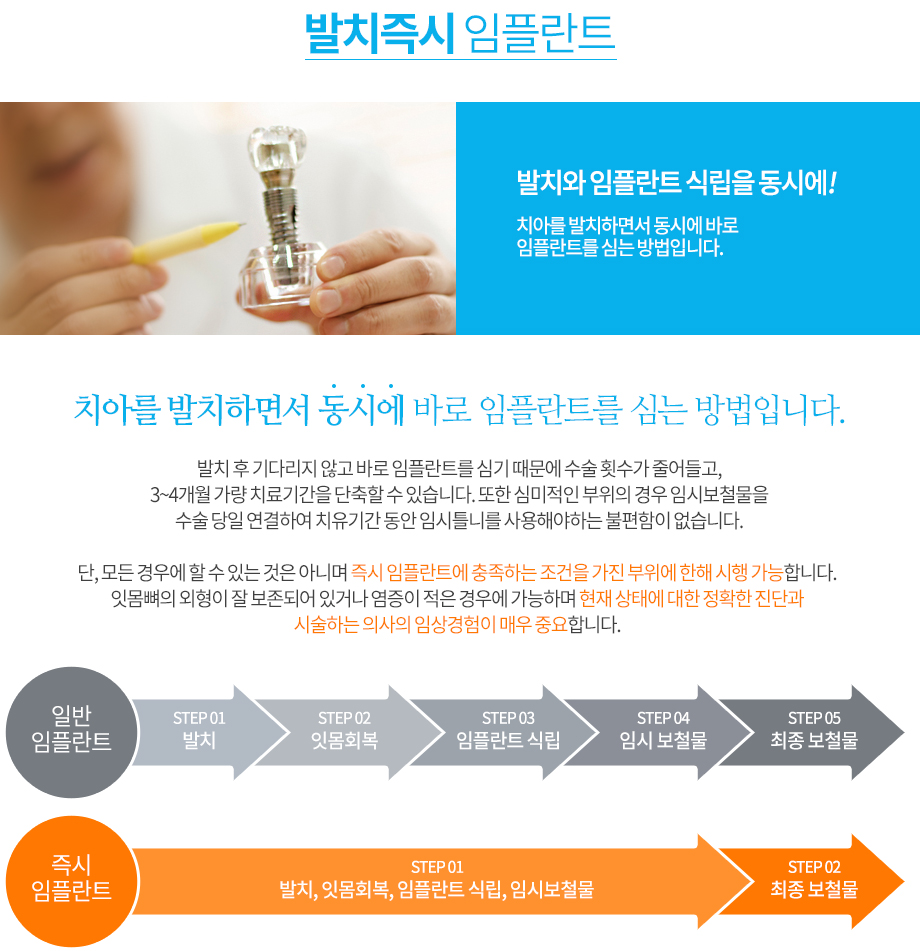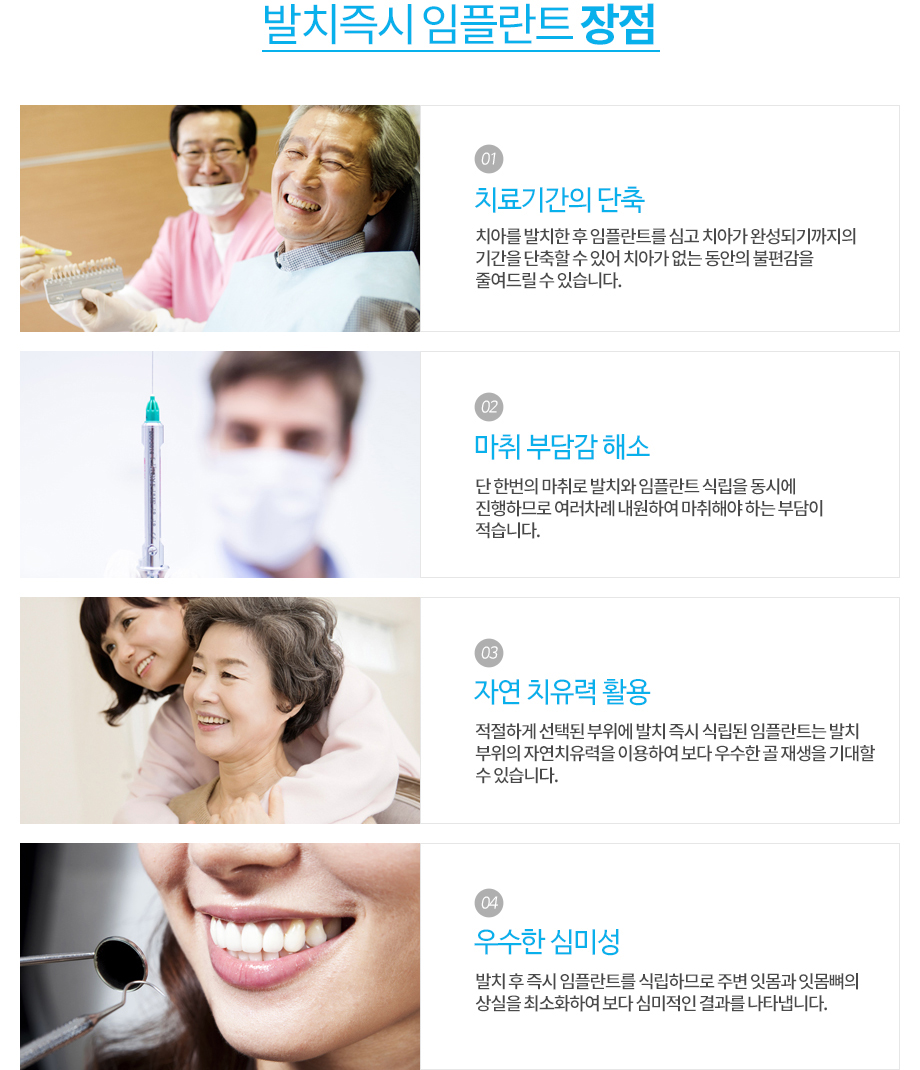 임플란트 병원선택의 중요성! 개인 주치의를 둔 듯한 편안하고 안전한 임플란트 치료 -풍부한 임상경험과 실력으로 다져진 know-how! 다년간의 임상 사례를 통해 개인별로 다 다른 상태에 맞추어 최상의 의료서비스 제공이 가능합니다. 일반적인 임플란트 수술부터, 고난도의 수술 및 임플란트 재수술까지 고루 갖춰진 실력이 이를 증명합니다. -최첨단 의료 장비를 통한 정밀진단과 안전한 임플란트 수술! 첨단 3D CT 진단을 통해 철저한 검진과 세심한 상담을 통해 원하는 임플란트 수술을 진행하며, 다양한 첨단 의료장비 보유로 안전한 수술이 될 수 있도록 항상 노력하고 있습니다. -1:1 환자 개인별 맞춤식 보철물 사고가 나서 사람을 알아보지 못할 경우 지문과 함께 그 사람임을 증명 하는 또 하나의 방법이 바로 치과 자료입니다. 그만큼 개인별로 다양한 치아상태와 건강 상태에 맞추어 꼼꼼한 치료가 이루어집니다. -철저한 임플란트 사후 보증, 관리 제도 임플란트는 수술만큼 중요한 것이 바로 이 관리입니다. 특히나 보철물 수복 후 1년 간은 매우 중요한 시기로 직접 임플란트를 집도한 의료진과 주기적인 체크를 하며 안정적으로 자리 잡는지 반드시 검진을 하셔야 합니다. 한번 치료하고 마무리 했으니 땡~? 아닙니다. 저희 치과에서는 정기적인 검진을 통해 임플란트를 오래도록 사용하실 수 있도록 유지 및 관리에도 철저한 노력을 기울여 드립니다.